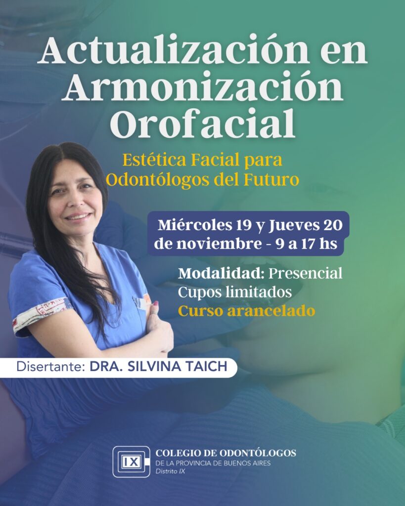 El Colegio de Odontólogos de la Provincia de Buenos Aires – Distrito IX invita a participar del Curso de Actualización en Armonización Orofacial, dictado por la Dra. Silvina Taich, dirigido a profesionales que buscan incorporar los últimos avances en estética facial dentro de su práctica odontológica.
